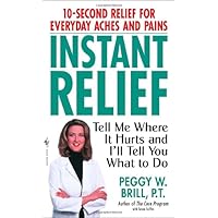 A renowned physical therapist helps you get rid of your pain in just 10 seconds.In this one-of-a-kind book, Peggy Brill, acclaimed author of The Core Program, shows you how to find relief from chronic and everyday aches and pains as well as all those stress-related pains that can attack so suddenly—whether you're at work, in a car or a plane, at home with your kids, recovering from surgery, or relaxing in bed. Instant Relief provides 100 clearly illustrated, easy-to-do 10-second exercises that provide immediate therapy for every part of your body—from your head to your toes.• Does your upper body ache after hours of hunching over a report due by the end of the day? Try doing the Brill Chicken. For extra relief,there's the Dead Brill Chicken.• Desperate to get rid of that tension headache? Try the Tongue Press, the Ear Tug, the Cheek Release, or the Scalp Glide.• Is your lower back killing you? Do the Pelvic Rock or the Pelvic Clock.• Feel those calves cramping up again? Do the Ankle Pump.• Need something to relieve your aching feet? Try the Foot Dome, the Toe Lift, or a simple self-massage.• Does your knee hurt when you walk downstairs? Do the Squeeze and Step.
